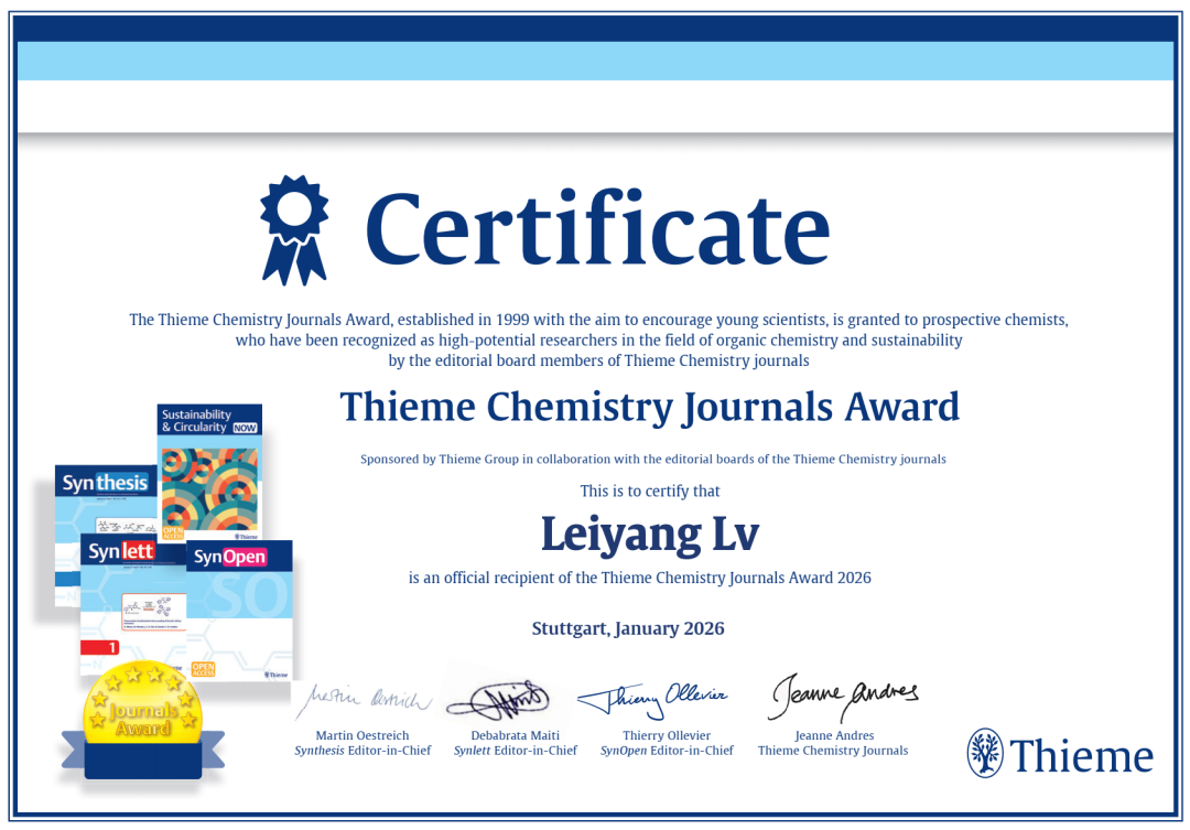 近日,世界著名的Thieme学术出版集团公布了2026年度“Thieme Chemistry Journals Award”的获奖名单,中国人民大学化学与生命资源学院的吕雷阳副教授成功入选,成为该学术奖2026年度的获得者之一。此次获奖标志着吕雷阳副教授的研究成果受到了国际同行的认可。